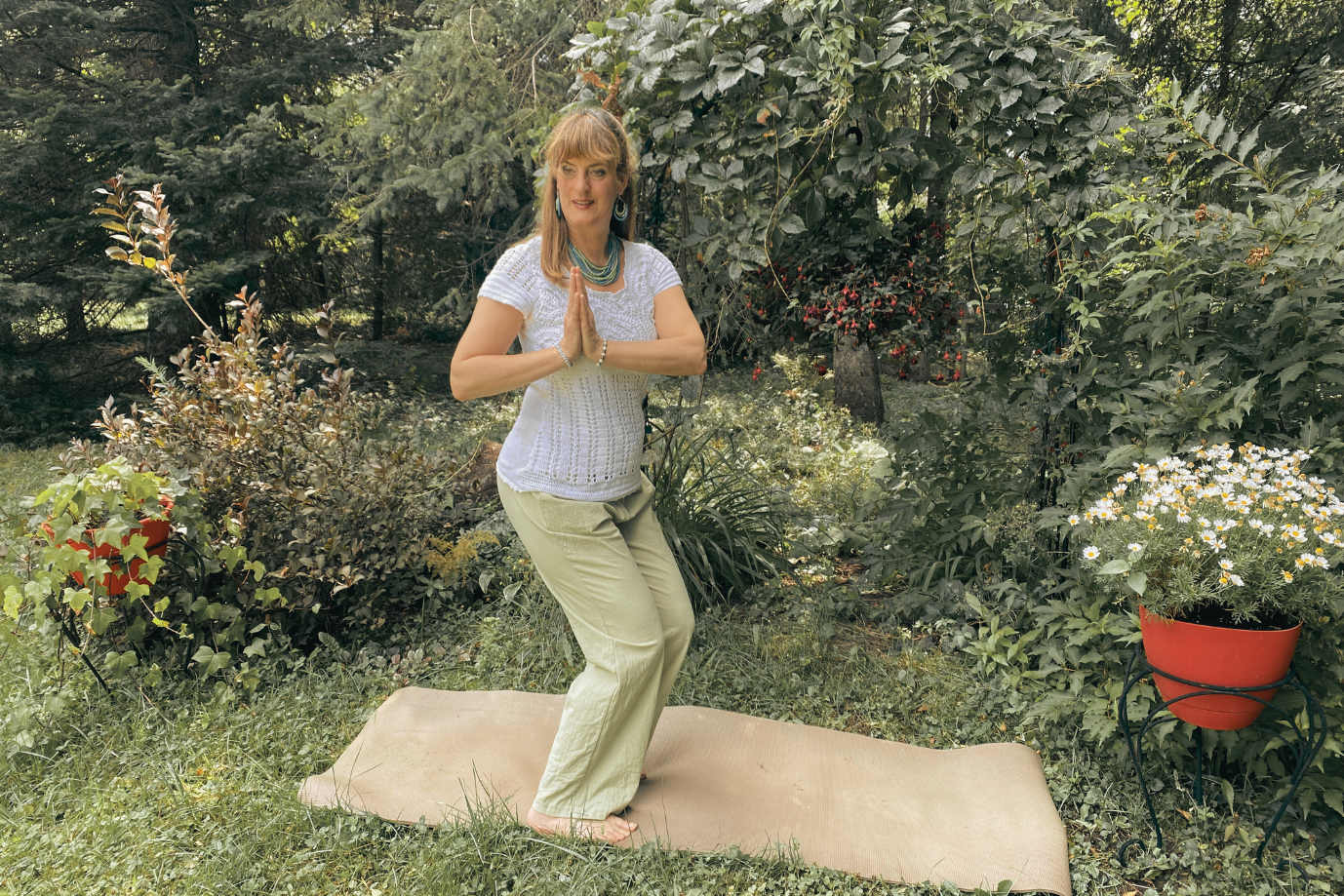 Michelle Yoga Douceur propose des cours de yoga en direct sur Zoom, accessibles partout peu importe où vous êtes.